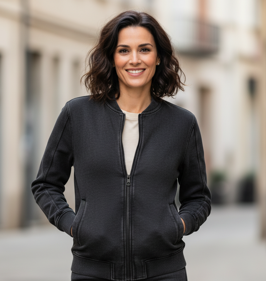Chaqueta Bomber negra Acid Wash confeccionada en 100% algodón, suave al tacto y con efecto lavado vintage que le da un estilo único.